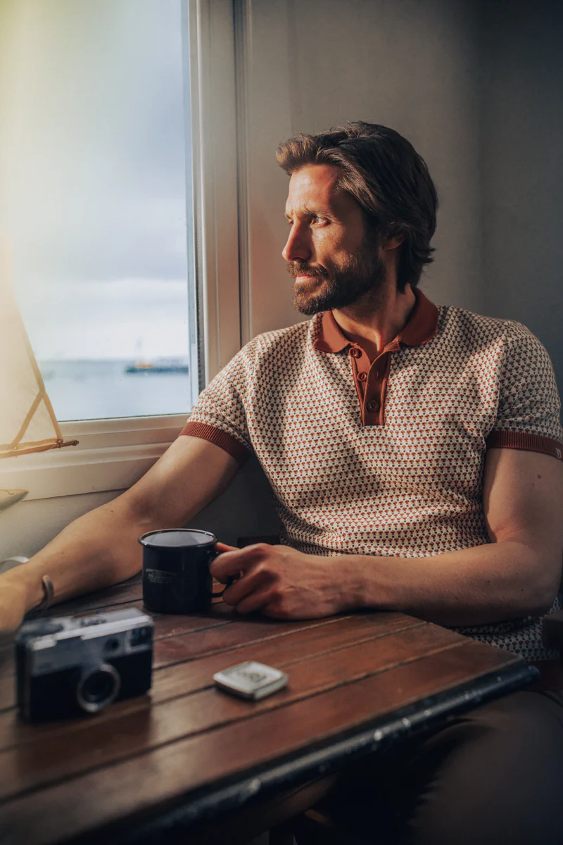 Woven from 100% cotton in a 16-gauge jacquard knit, this piece brings breathable comfort and refined texture in equal measure. The warm tones of Off White, Auburn, and Navy are perfectly balanced by a fitted silhouette and crisp detailing - from the ribbed trim to the subtle three-button placket with Corozo buttons.