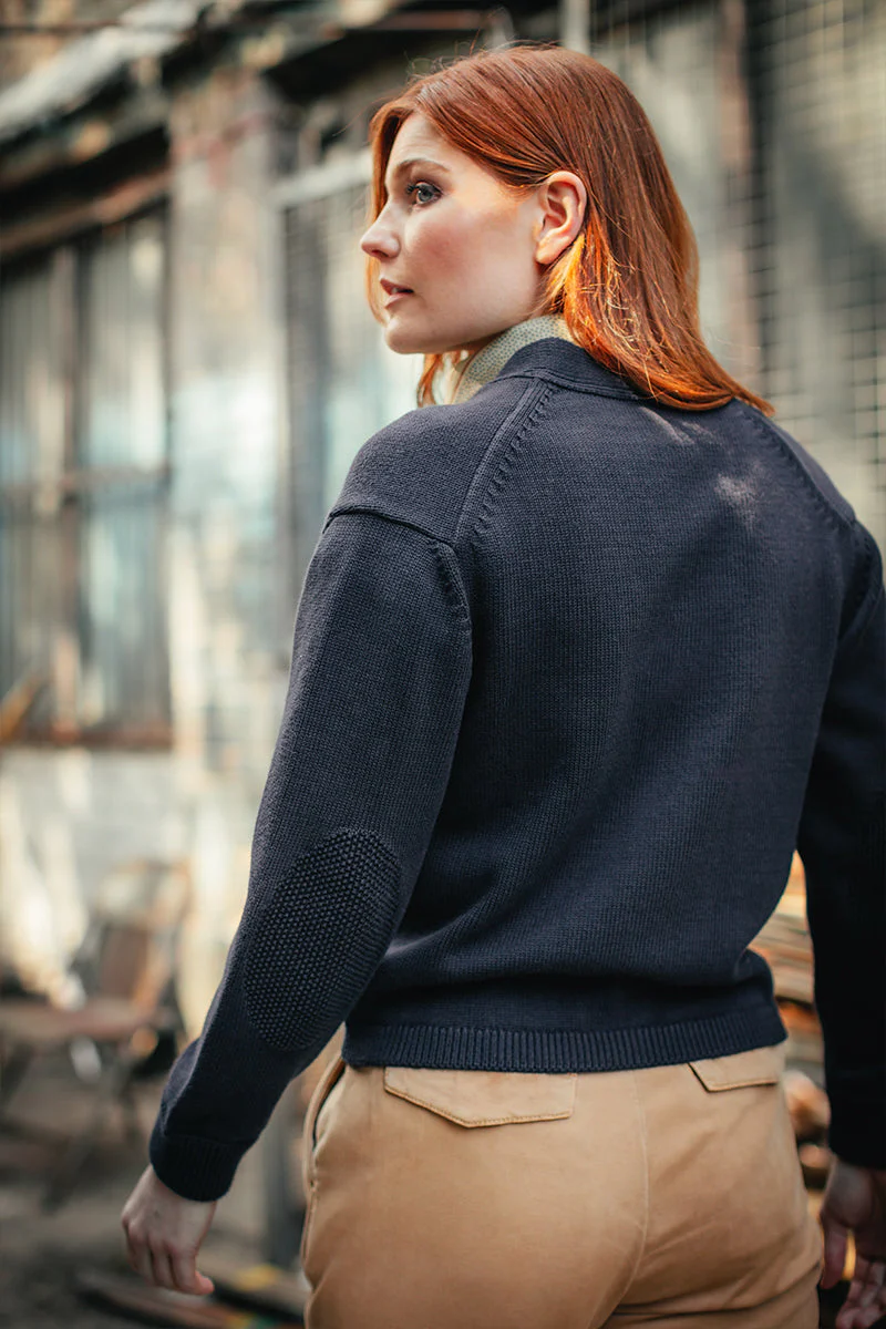 Made from 100% cotton, this navy cardigan features two deep front pockets and knitted elbow patches. On the left side, there is a boucle applique patch with our signature swallow detail embroidered on top. It’s easy to style and adds a youthful elegance to a classic piece.
