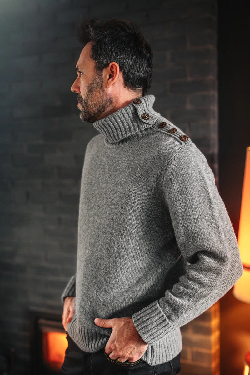 Inspired by the indomitable spirit of Cornish fishermen, the Ahab Submariner embraces their legacy and offers you the timeless details you've come to cherish. Our new grey knit is crafted from a responsibly sourced wool blend, ensuring a garment that's soft, warm, and never itchy, destined to gracefully age with time.