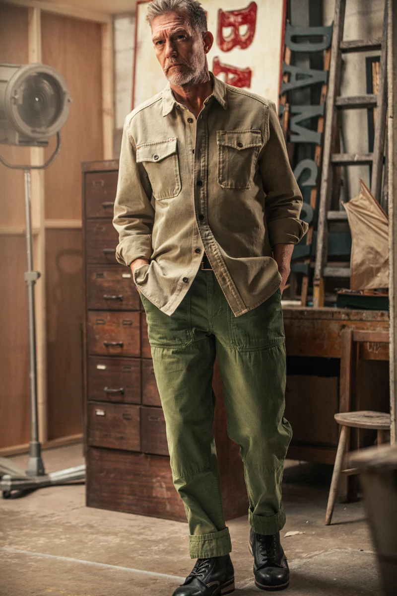 Made from 315gsm cotton twill, the fabric carries real weight and texture without stiffness. Garment dyed after construction, the khaki colour has depth and variation rather than a flat, uniform finish, and will continue to change with wear.